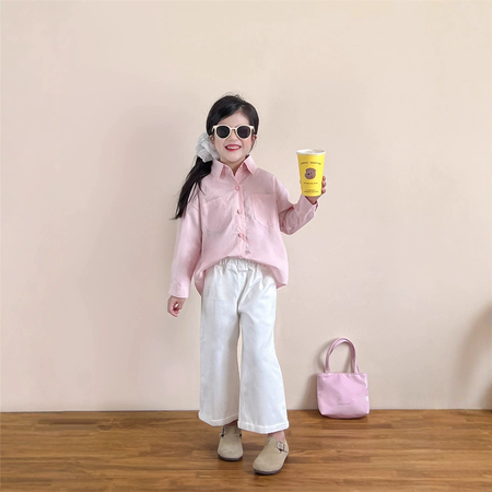 1*7收藏“粉色长袖衬衣白色翻边直筒长裤套装”