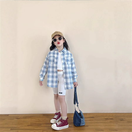 1*7收藏“蓝色格子圆弧摆长袖衬衣”