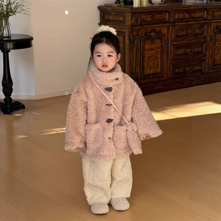 成*萍下载“配包包粉色皮毛一体中长款不规则羊角扣外套”图片包