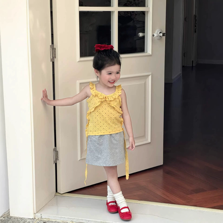1*5收藏“镂空木耳边黄色满印波点吊带防走光灰色卫裙”