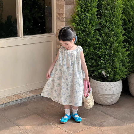1*4收藏“蓝色碎花无袖圆领宽松中长款连衣裙”